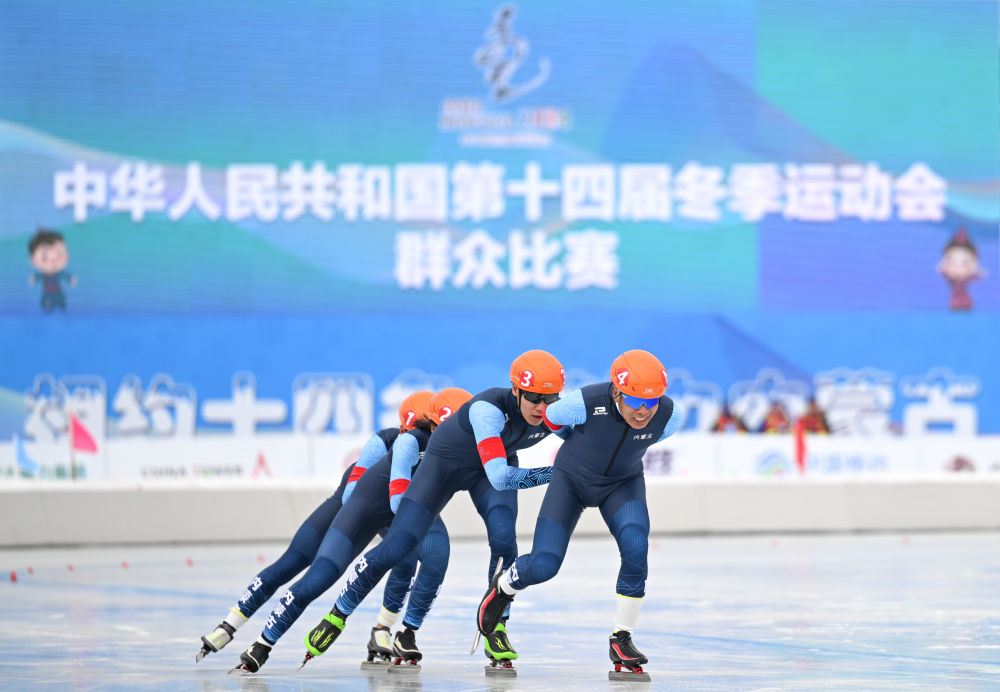 1月13日,内蒙古队选手在2000米混合团体赛中。当日,第十四届全国冬季运动会群众速度滑冰比赛在内蒙古呼和浩特市东河冰场开赛。新华社记者 贝赫 摄