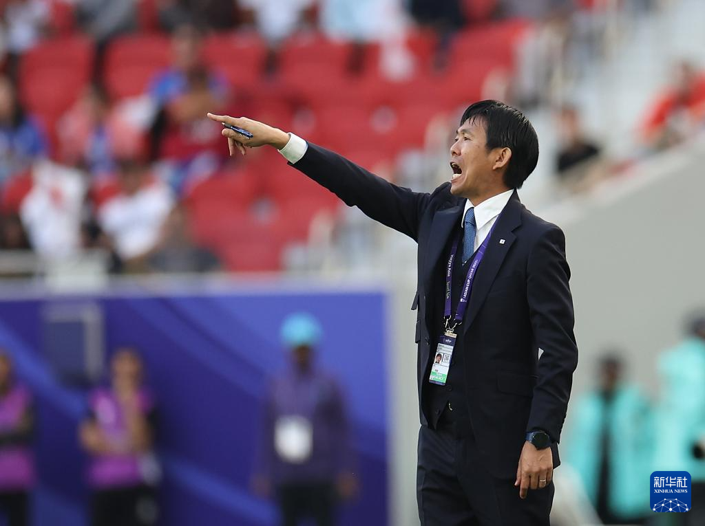 1月14日,日本队主教练森保一比赛中指挥。新华社记者 曹灿 摄