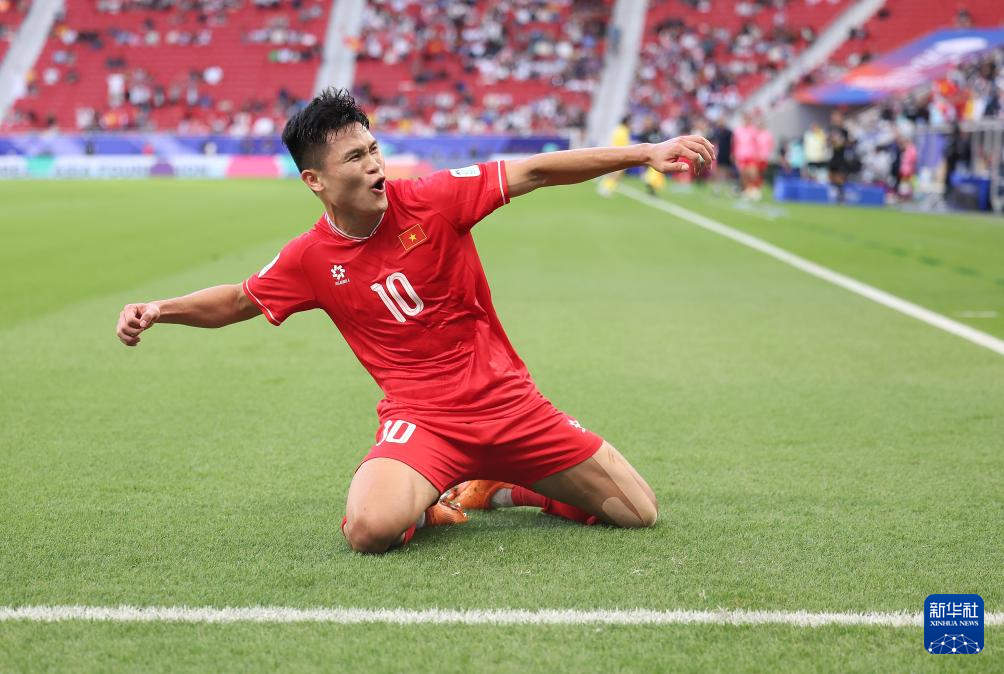 1月14日,越南队球员范俊海在比赛中庆祝进球。新华社记者 曹灿 摄