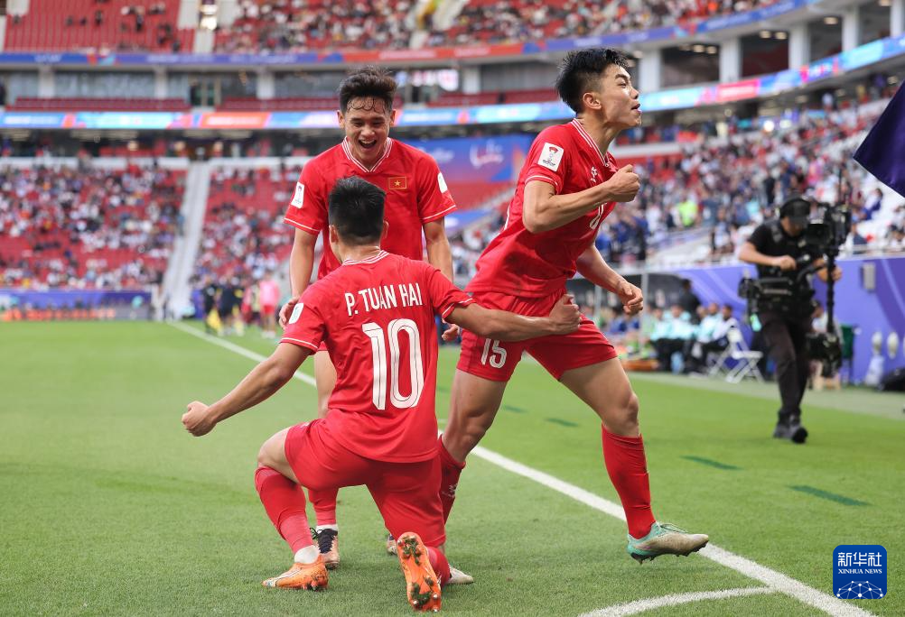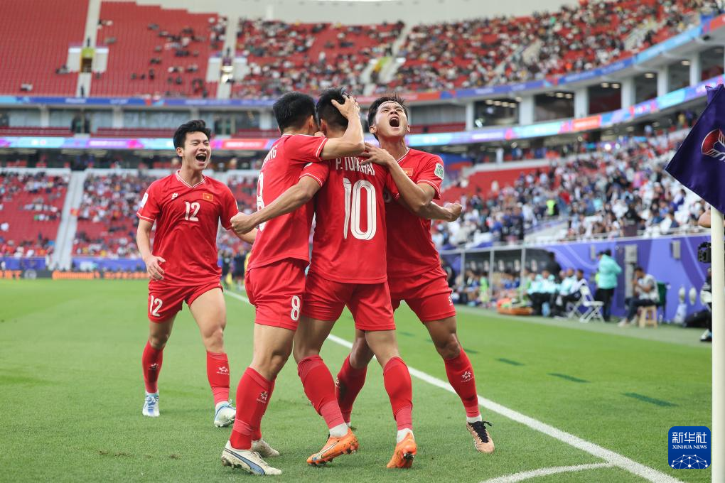 1月14日,越南队球员范俊海(右二)在比赛中庆祝进球。新华社记者 曹灿 摄
