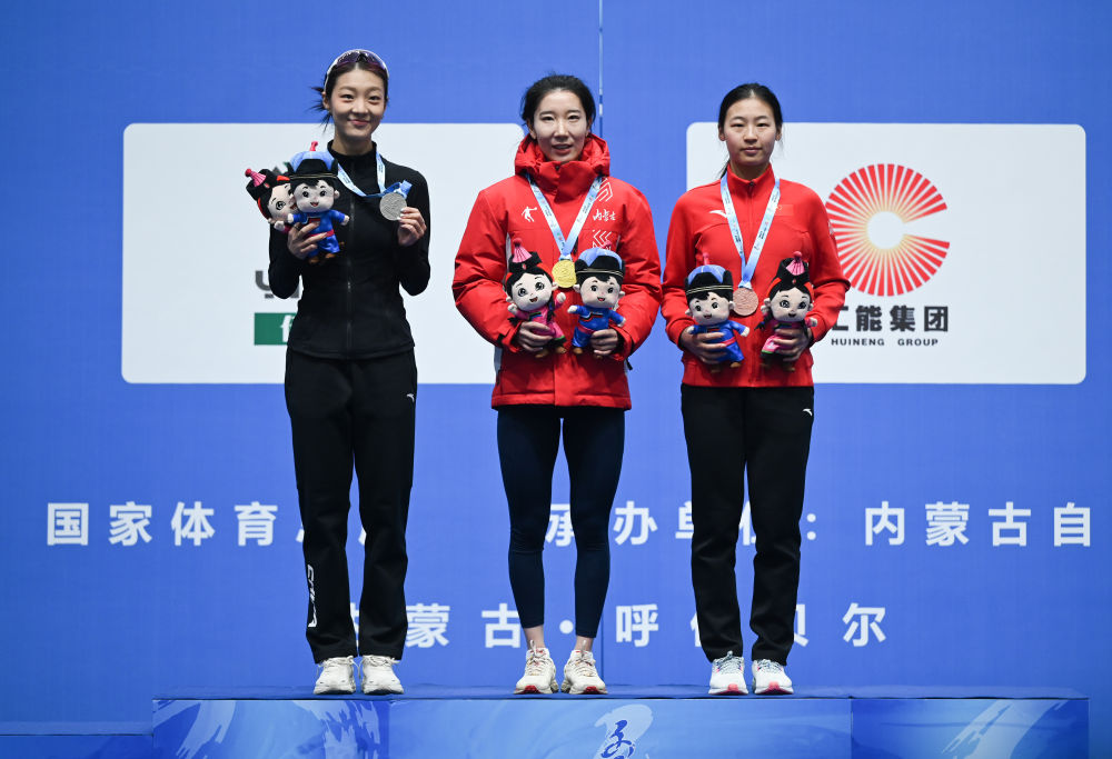 1月14日,女子5000米冠军内蒙古队选手韩梅(中)、亚军天津队选手杨滨瑜(左)和季军河北队选手黄余琳在颁奖仪式上合影。新华社记者 连振 摄