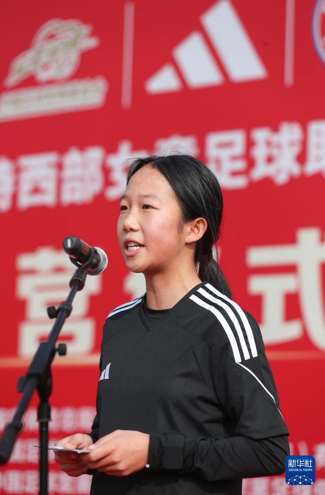 1月15日,球员代表、四川资中体校U15女足队员王晨西在开营仪式上发言。新华社记者 江宏景 摄