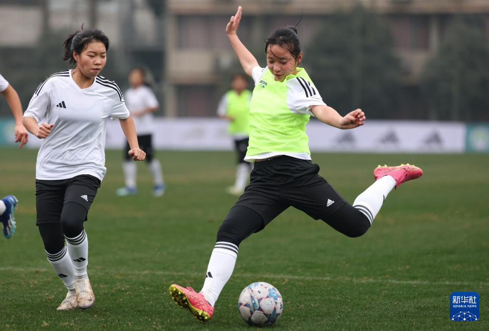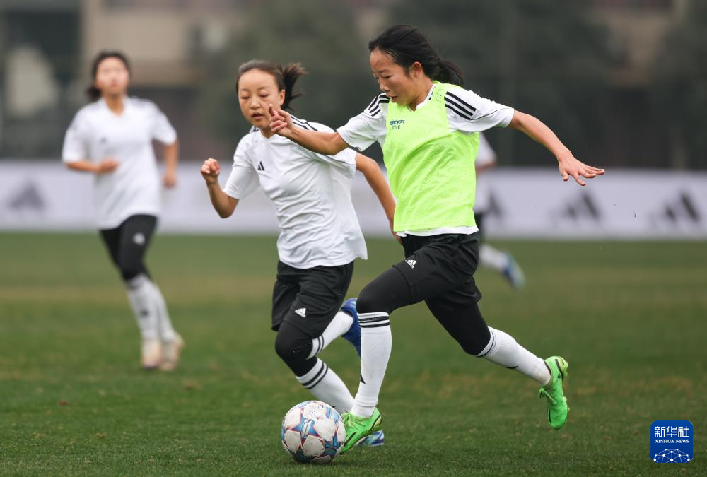 1月15日,四川资中体校U15女足队员王晨西(右)在成都市温江足球基地训练。新华社记者 江宏景 摄