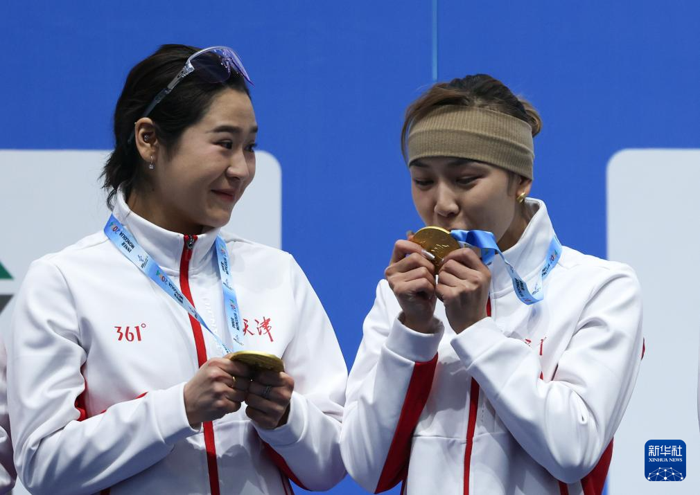 1月14日,天津队选手阿合娜尔·阿达克(右)在颁奖仪式上亲吻金牌。新华社记者 王楷焱 摄