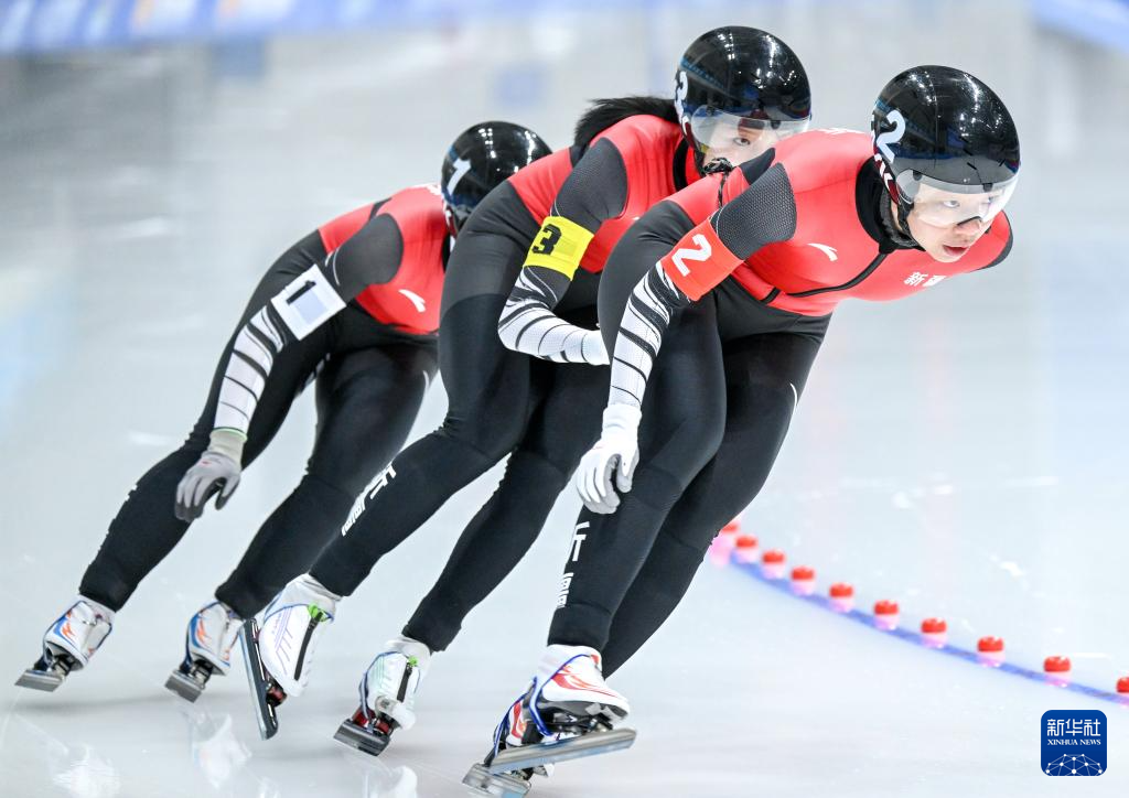 1月14日,新疆队选手殷琦、陈翔宇、田芮宁(从右至左)在比赛中。新华社记者 连振 摄