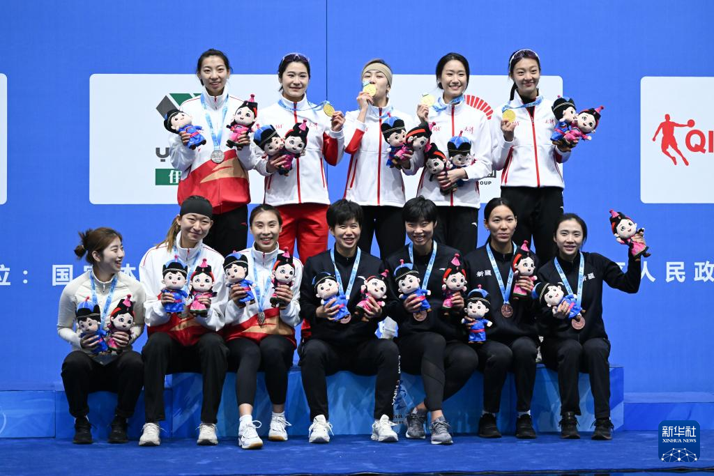 1月14日,天津队选手(上)、新疆队选手(下右)、吉林队选手(下左)在颁奖典礼上合影。新华社记者 连振 摄