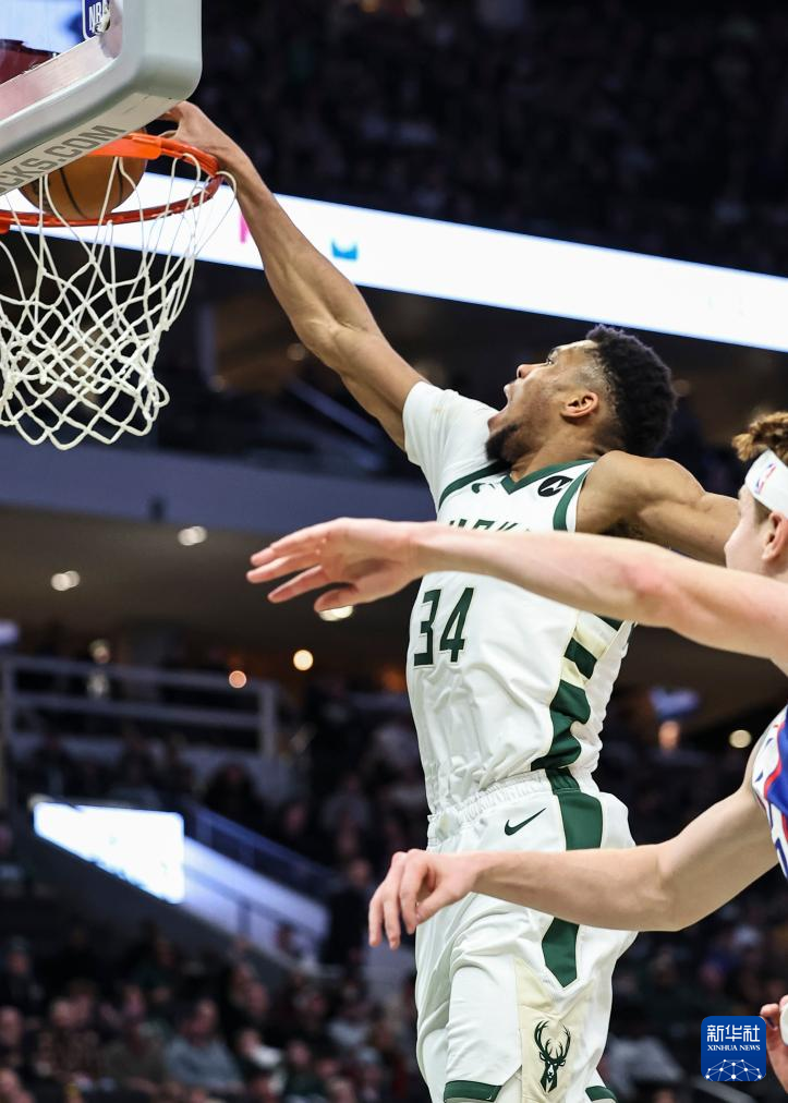 1月14日,雄鹿队球员扬内斯·安特托昆博在比赛中扣篮。新华社发(乔尔·莱纳摄)
