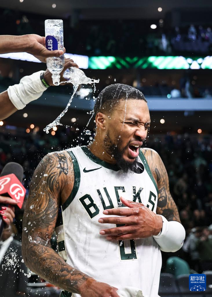 1月14日,雄鹿队球员利拉德在比赛中投中制胜三分球后被队友浇水庆祝。新华社发(乔尔·莱纳摄)