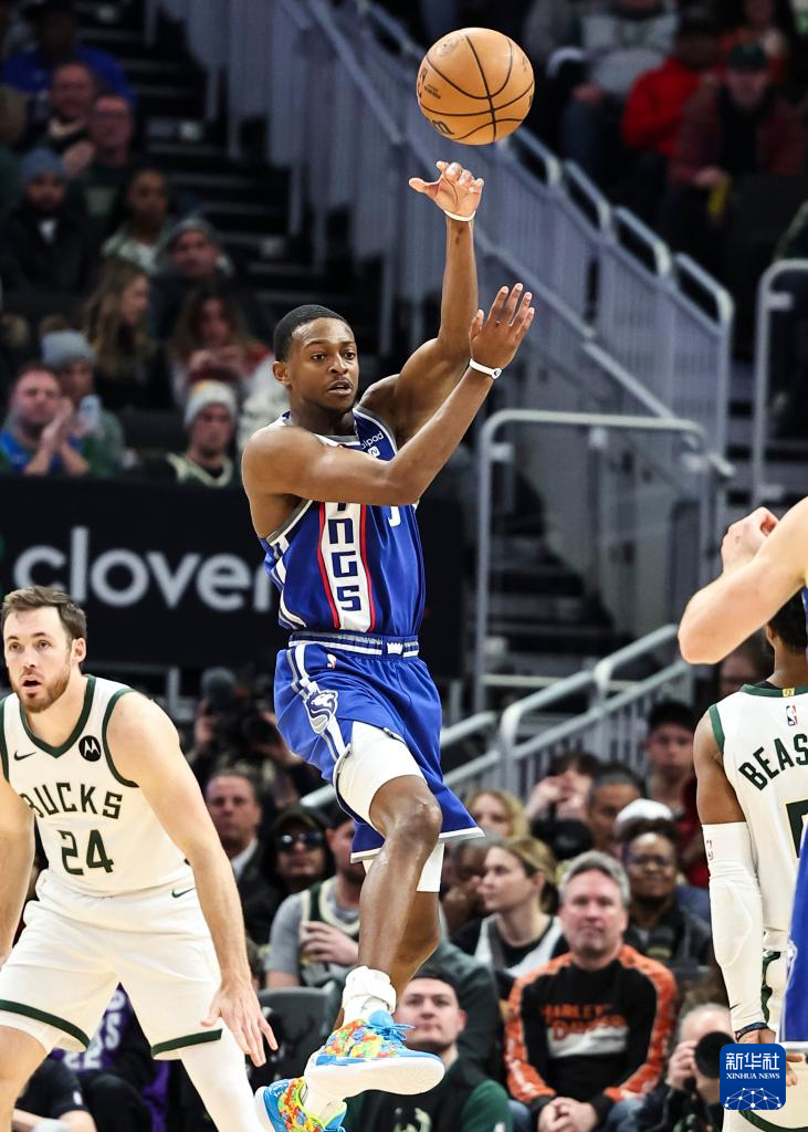 1月14日,国王队球员福克斯在比赛中空中传球。新华社发(乔尔·莱纳摄)