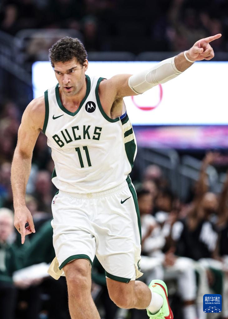1月14日,雄鹿队球员洛佩兹在比赛中庆祝得分。新华社发(乔尔·莱纳摄)