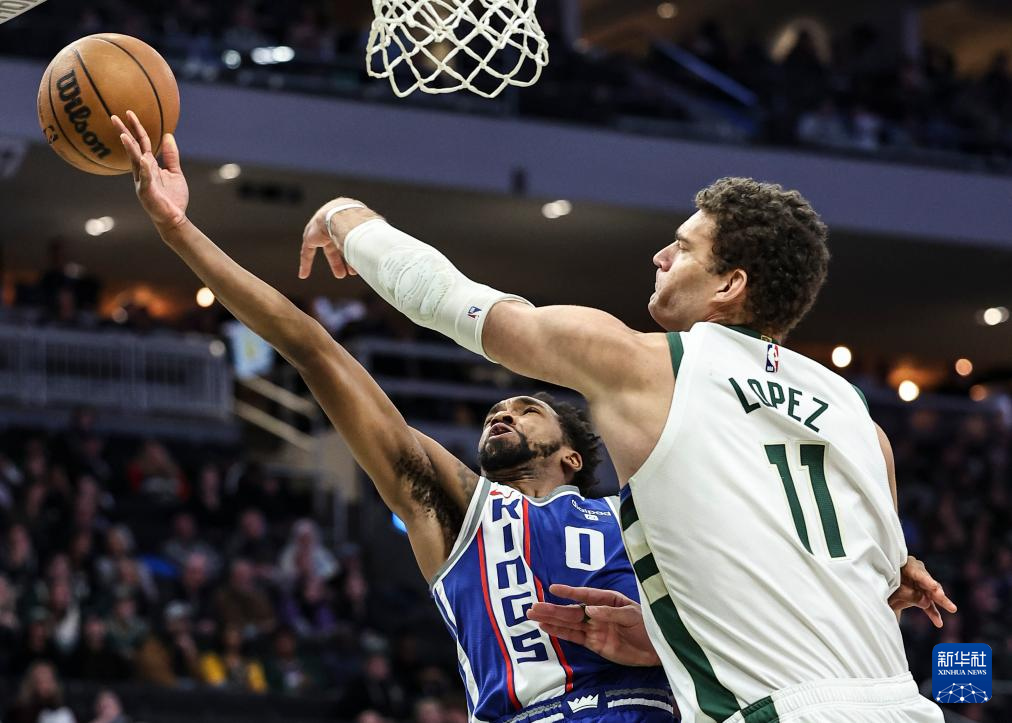 1月14日,雄鹿队球员洛佩兹(中)在比赛中上篮。新华社发(乔尔·莱纳摄)