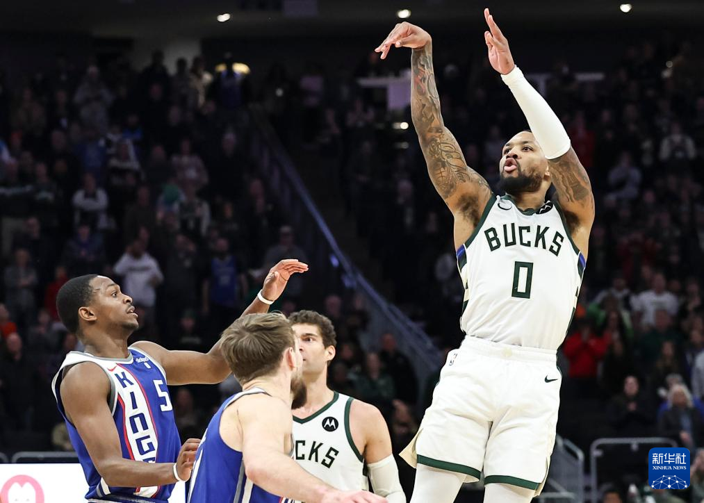 1月14日,雄鹿队球员利拉德(右)在比赛中投中制胜三分球。新华社发(乔尔·莱纳摄)