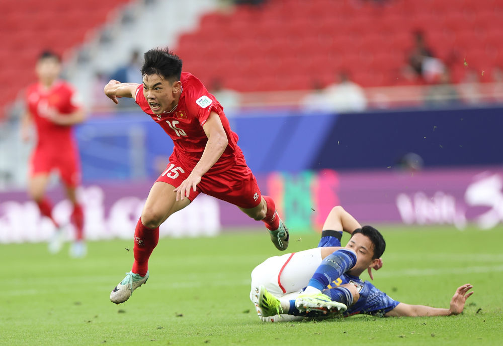1月14日,越南队球员阮庭北(左)在比赛中突破。当日,在卡塔尔多哈举行的男足亚洲杯小组赛D组比赛中,日本队4:2战胜越南队。新华社记者 曹灿 摄