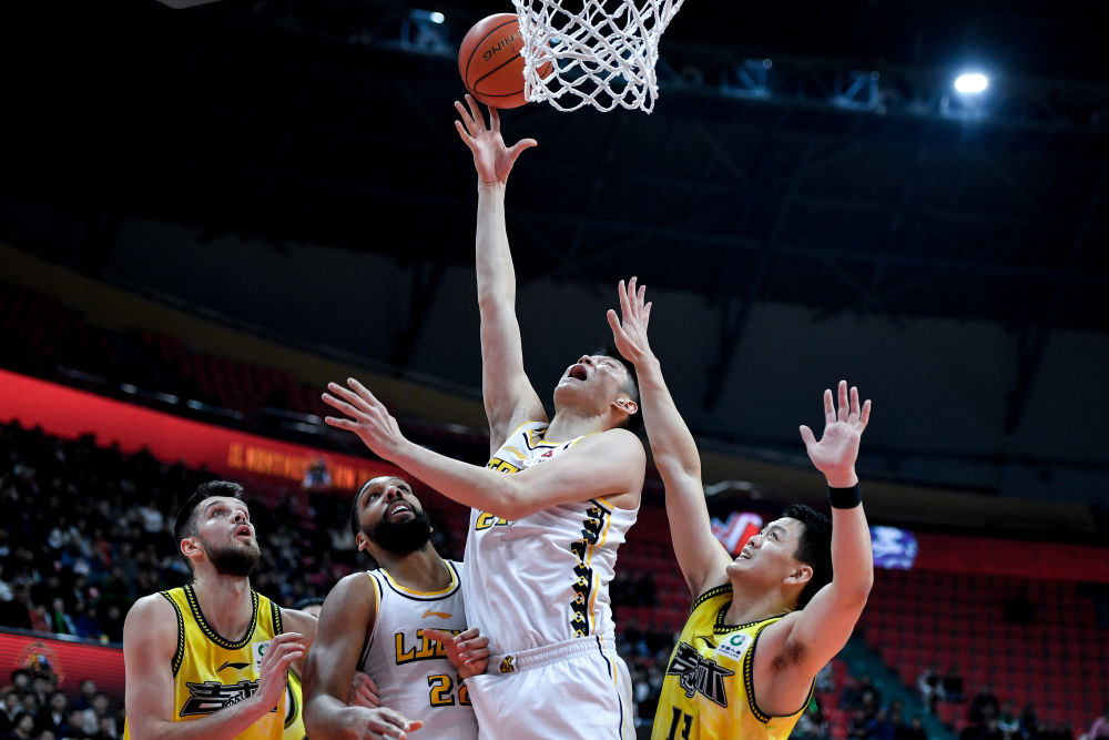 1月15日,广厦队胡金秋(右二)在比赛中上篮。新华社记者 许畅 摄
