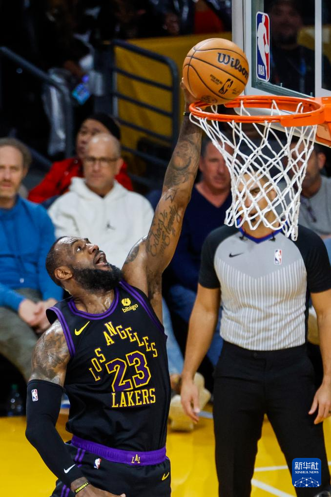 1月15日,湖人队球员勒布朗·詹姆斯在比赛中扣篮。新华社发(赵汉荣摄)