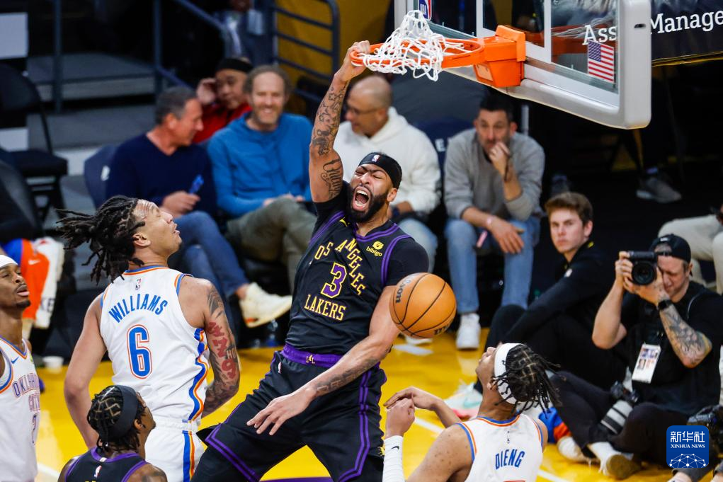 1月15日,湖人队球员安东尼·戴维斯(中)在比赛中扣篮得分。新华社发(赵汉荣摄)