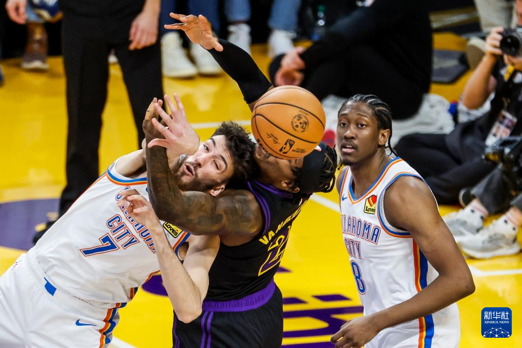 1月15日,雷霆队球员切特·霍姆格伦(左)与湖人队球员贾里德·范德比尔特(中)在比赛中拼抢。新华社发(赵汉荣摄)
