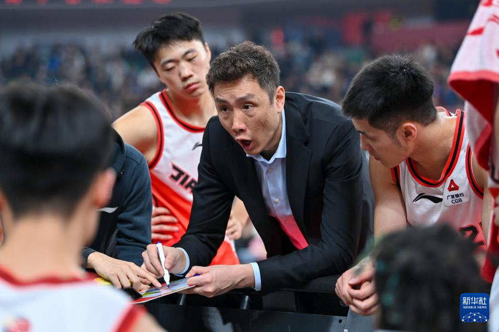 1月15日,江苏肯帝亚队主教练易立(右二)在比赛暂停期间布置战术。新华社记者 杨晨光 摄