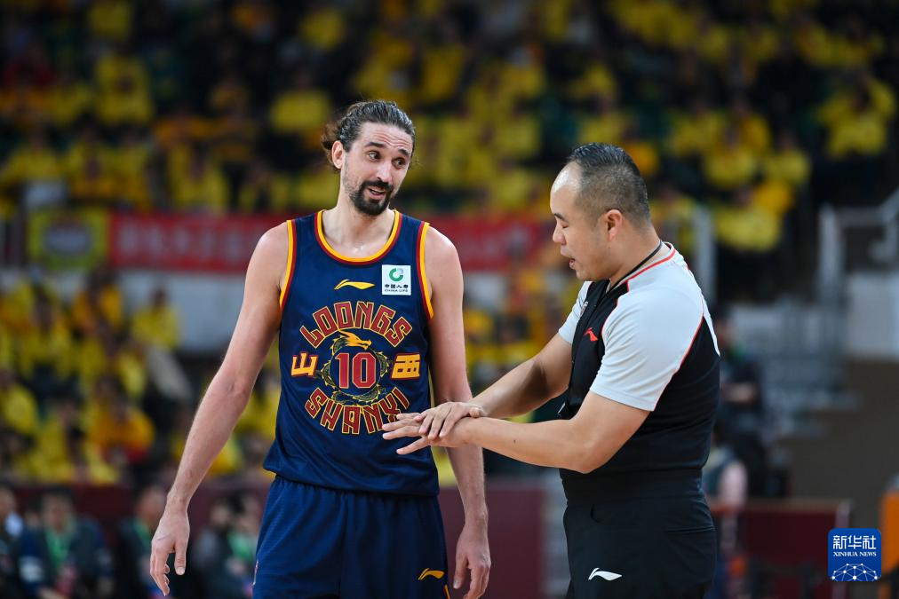 1月15日,山西汾酒队球员施韦德(左)在比赛中与裁判沟通。新华社记者 杨晨光 摄