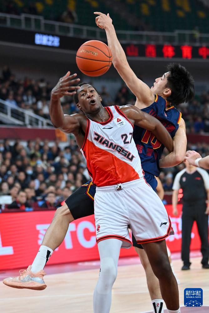 1月15日,江苏肯帝亚队球员卡巴(左)和山西汾酒队球员韩霈瑜在比赛中拼抢。新华社记者 杨晨光 摄