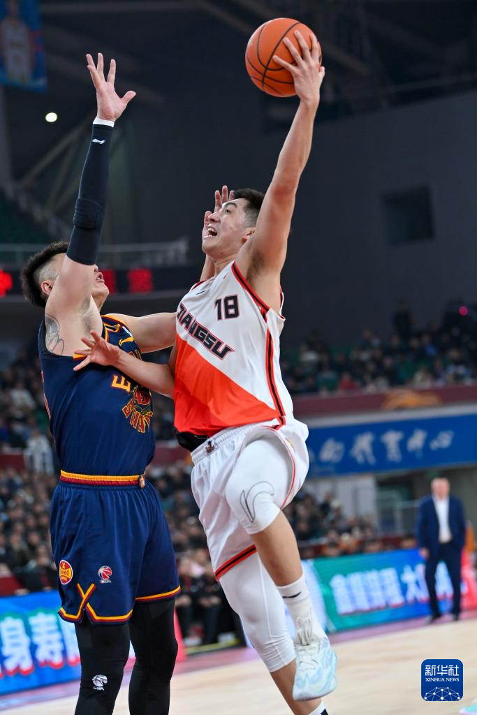 1月15日,江苏肯帝亚队球员蒋浩然(左)在山西汾酒队球员常林的防守下上篮。新华社记者 杨晨光 摄