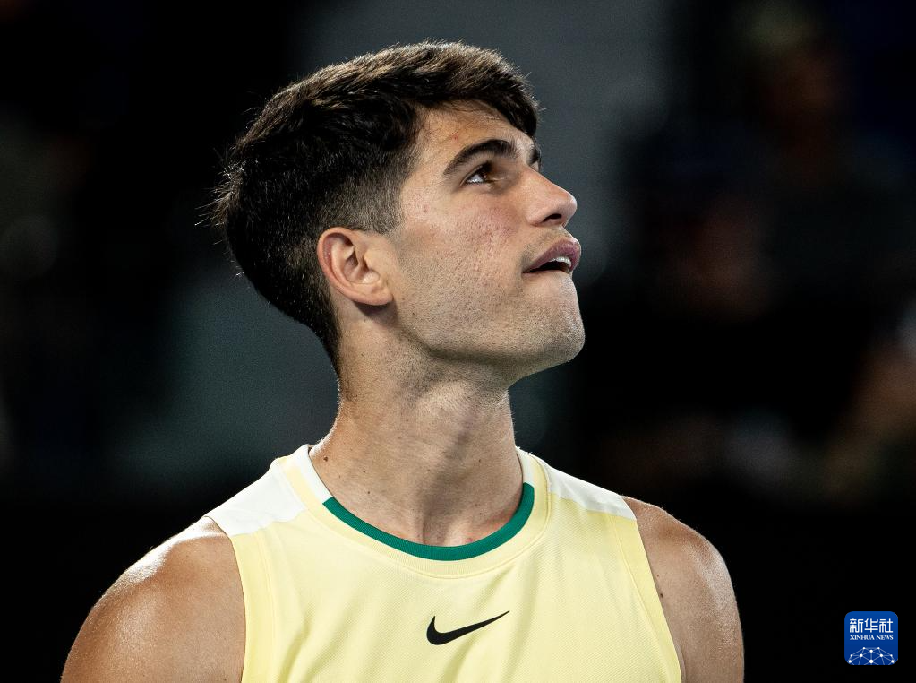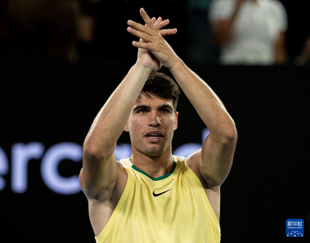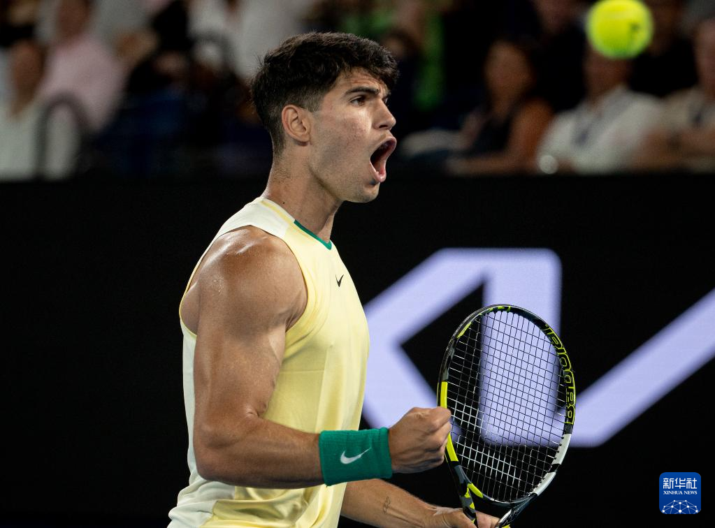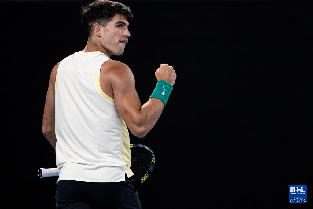 1月16日,阿尔卡拉斯庆祝比赛胜利。新华社发(胡泾辰摄)