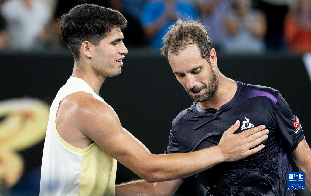 1月16日,阿尔卡拉斯(左)与加斯奎特在赛后互相致意。新华社发(胡泾辰摄)