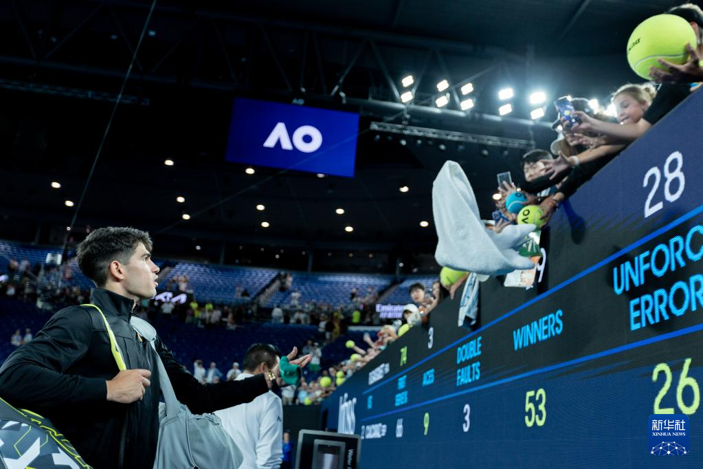 1月16日,阿尔卡拉斯在比赛后与球迷互动。新华社发(胡泾辰摄)
