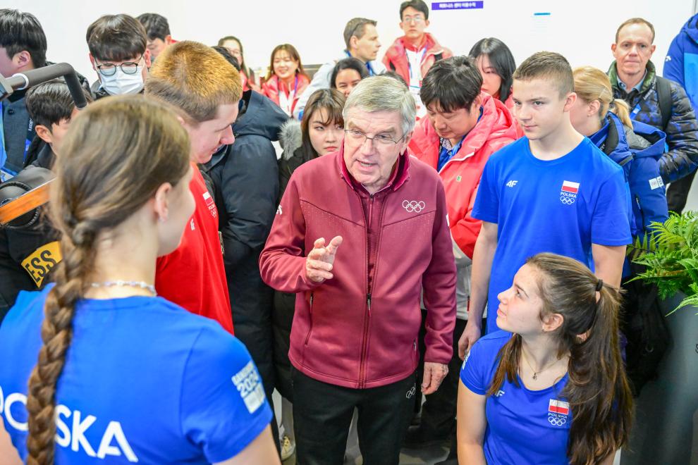 巴赫在江原道冬青奥会协调委员会主席张虹陪同下走进运动员村,视察了多功能健身区、宿舍、餐厅等区域,并与多个代表团的运动员交谈、合影。巴赫还为运动员们送上了“礼物”——国际奥委会的徽章。
