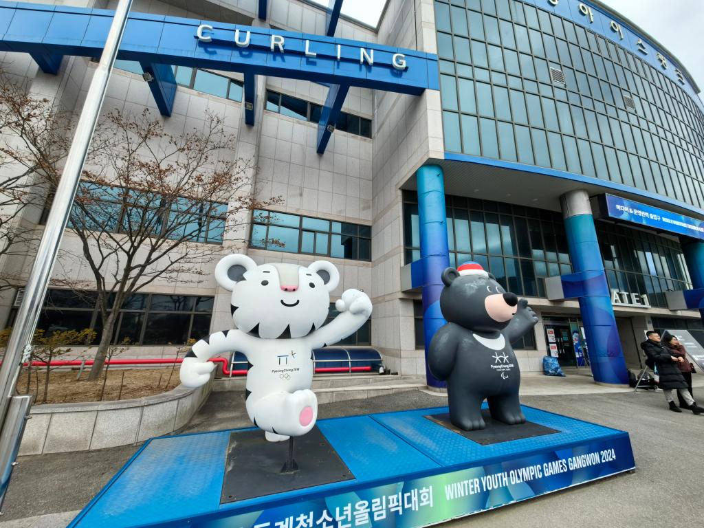 场馆外摆放的平昌冬奥会吉祥物。新华社记者 姬烨 摄