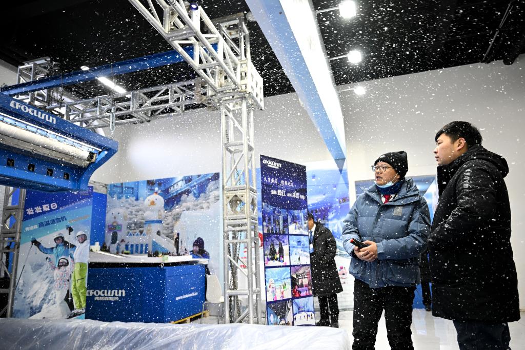 2023年12月16日,市民在展销会上观看飘雪机飘雪。当日,2023年首届呼伦贝尔·海拉尔冰雪产品冬季展销会在内蒙古呼伦贝尔市海拉尔区开幕。新华社记者 贝赫 摄
