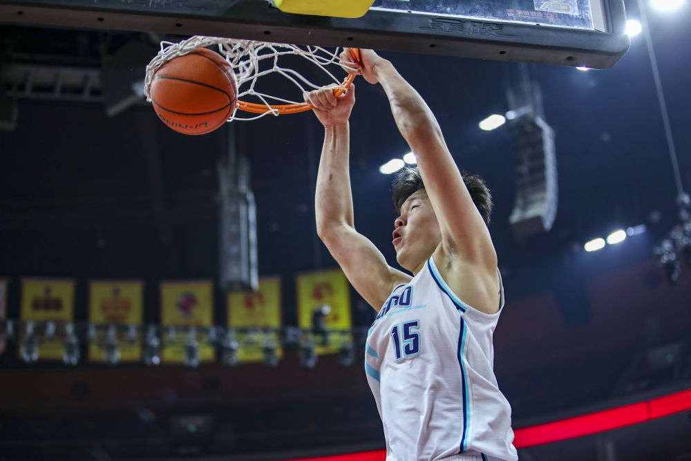 1月16日,青岛队球员杨瀚森在比赛中扣篮。新华社发(郑家雄摄)