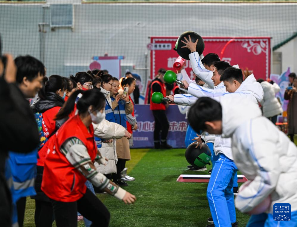 1月18日,在呼伦贝尔学院体育馆内,“十四冬”志愿者参加趣味体能比赛。新华社记者 刘磊 摄
