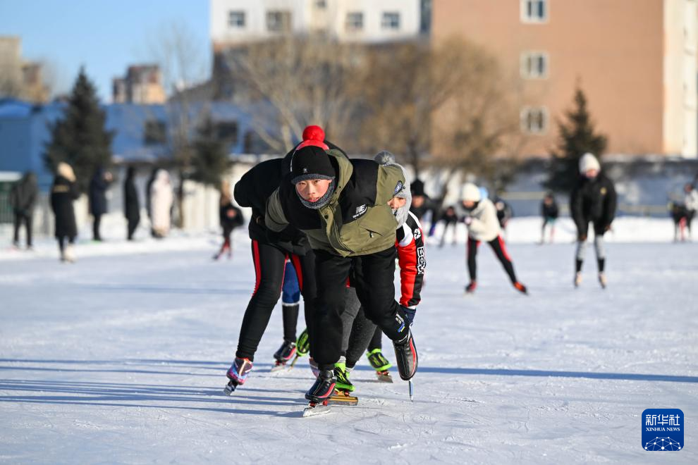 1月18日,呼伦贝尔市海拉尔区第七中学的学生们在校园里滑冰。新华社记者 刘磊 摄