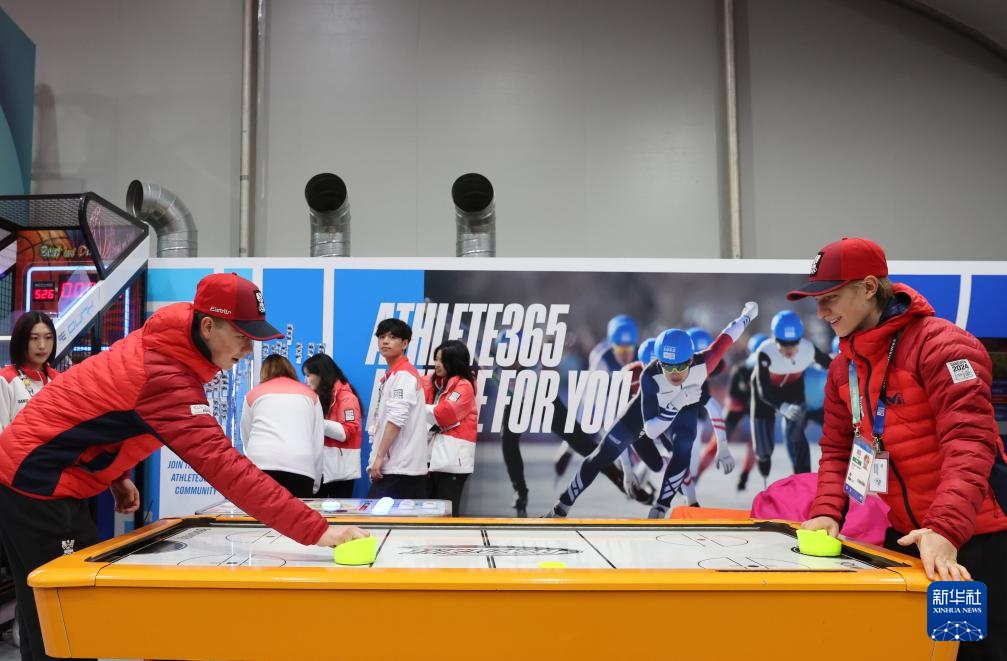 1月18日,运动员在冬青奥村内体验桌上冰球。新华社记者 姚琪琳 摄