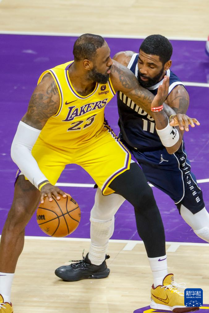1月17日,独行侠队球员凯里·欧文(右)在比赛中防守湖人队球员勒布朗·詹姆斯。新华社发(赵汉荣摄)