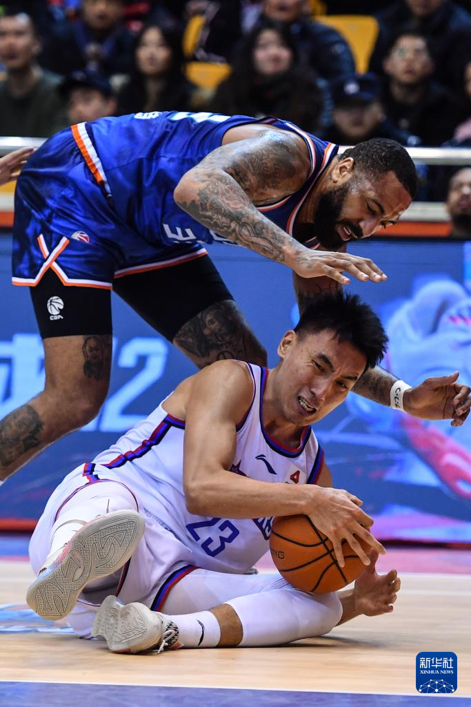 1月17日,山东高速队球员吉伦沃特(上)和天津先行者队球员时德帅在比赛中争球。新华社记者 朱峥 摄