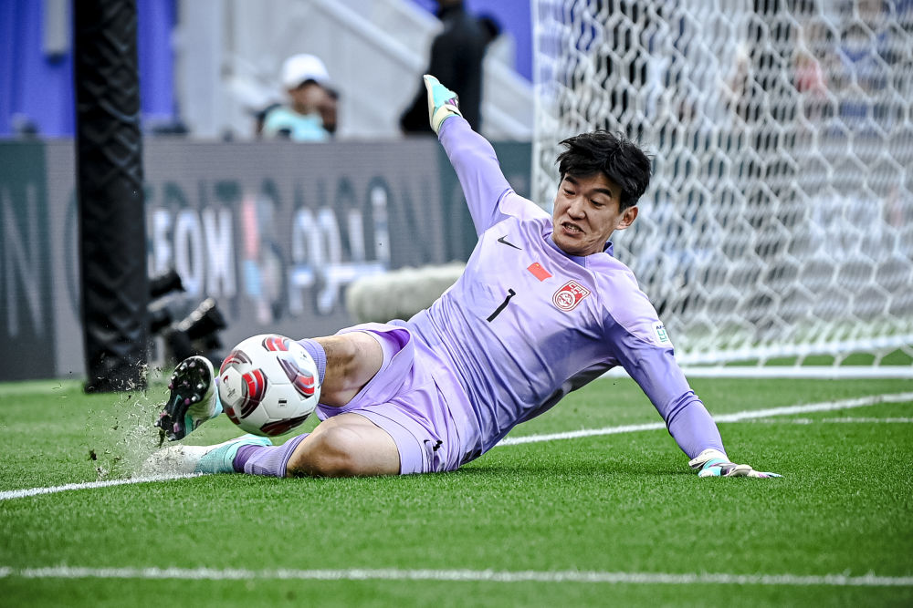 1月17日,中国队守门员颜骏凌在比赛中底线救球。新华社记者 江汉 摄