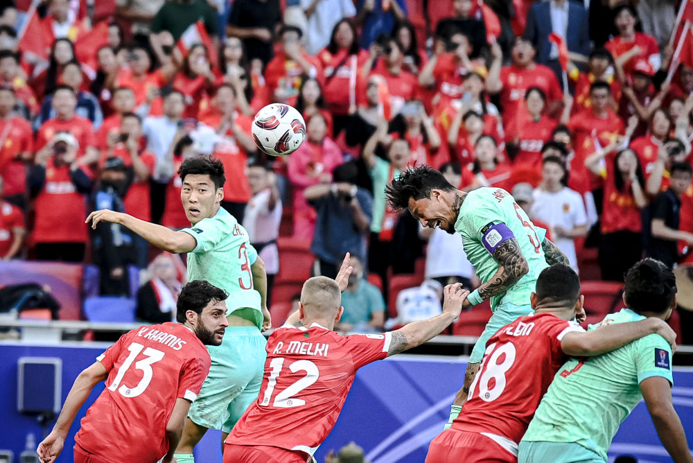 1月17日,中国队球员张琳芃(上右)在比赛中头球攻门。新华社记者 江汉 摄
