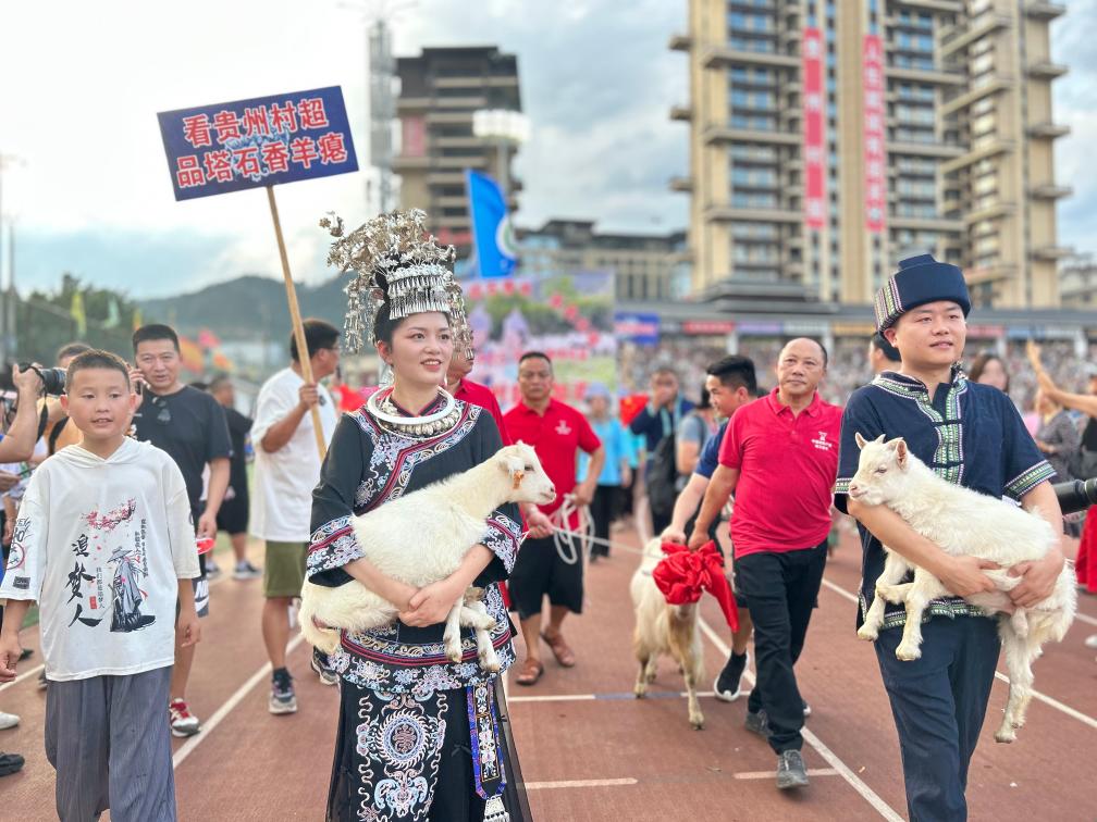 “村超”赛场上,季军奖品正是塔石香羊。赛事期间,塔石干部群众多次组成拉拉队到赛场助威,他们身着少数民族服饰,举着塔石香羊招牌,怀抱、手牵塔石香羊入场巡游,收获了极高流量。