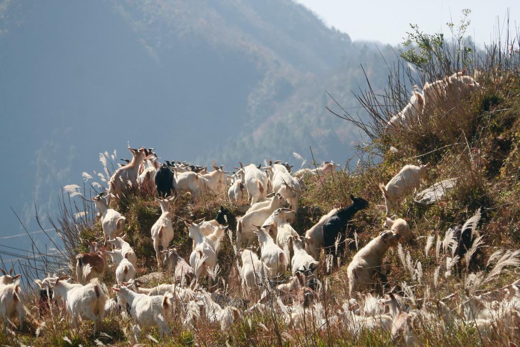 2023年11月28日,在贵州省黔东南州榕江县塔石瑶族水族乡党调村,塔石香羊出圈上山。(潘明燕 摄)