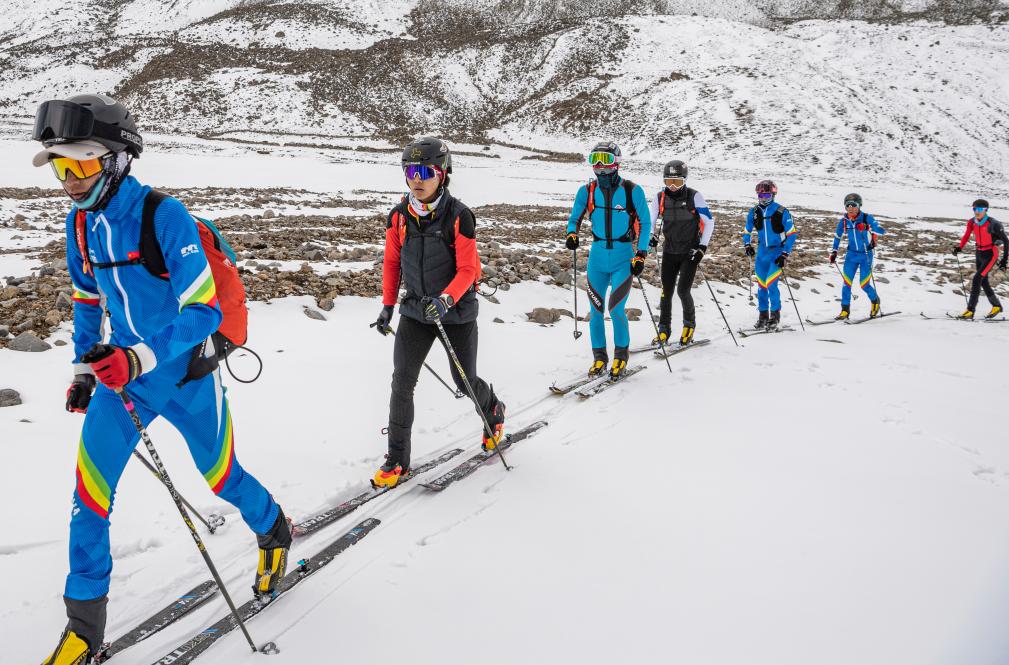 ↑在西藏拉萨市当雄县羊八井镇,玉珍拉姆(左二)和队友进行滑雪登山训练(2023年5月2日摄)。