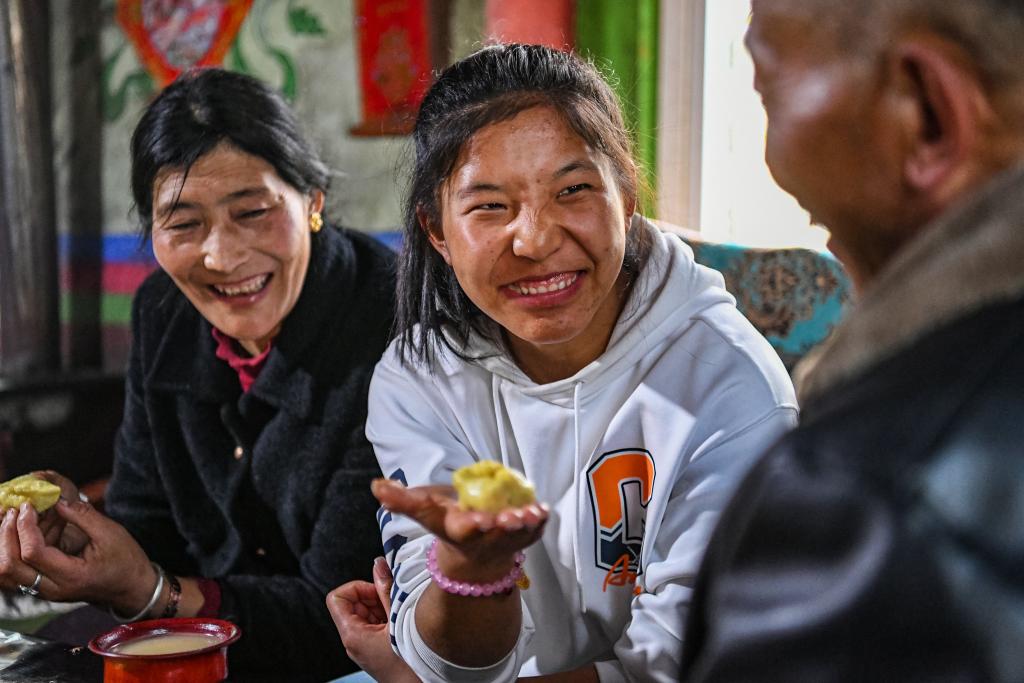 ↑在位于西藏林芝市工布江达县仲莎乡的家中,玉珍拉姆(中)向爸爸展示自己做的土豆包子(2023年4月24日摄)。
