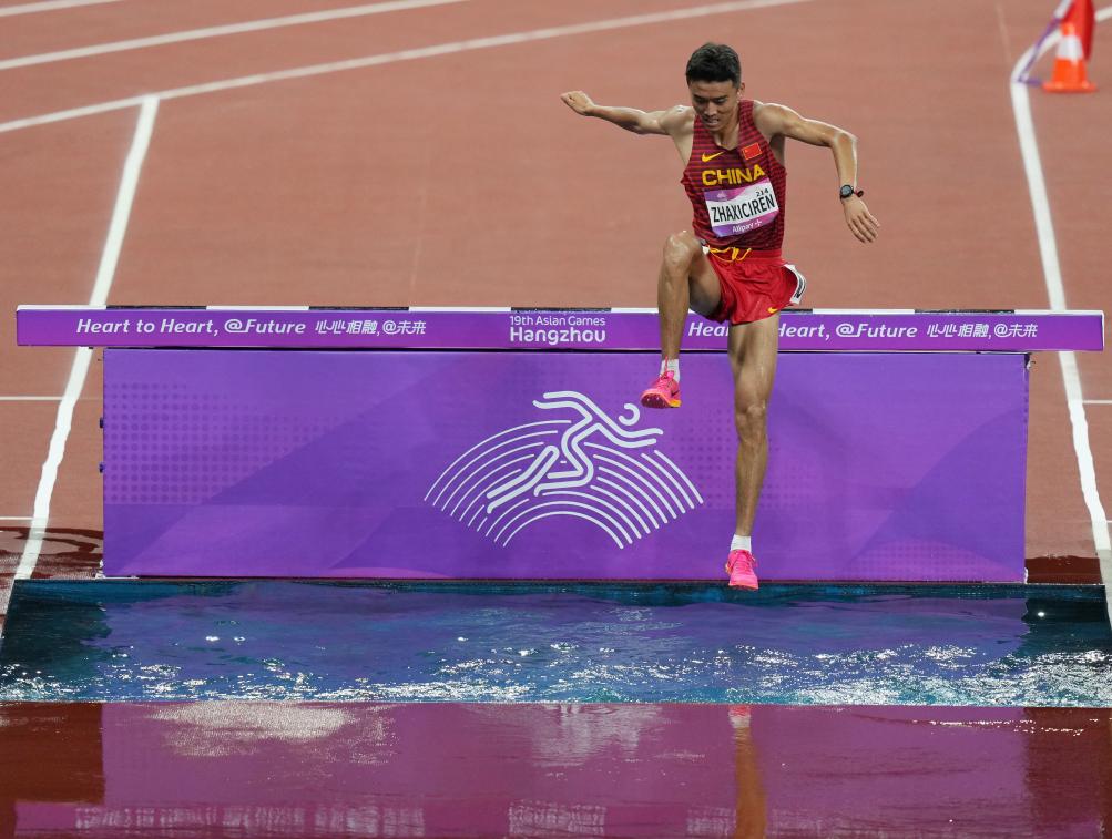 ↑中国运动员扎西次仁在第十九届杭州亚运会男子3000米障碍赛决赛中(2023年10月1日摄)。