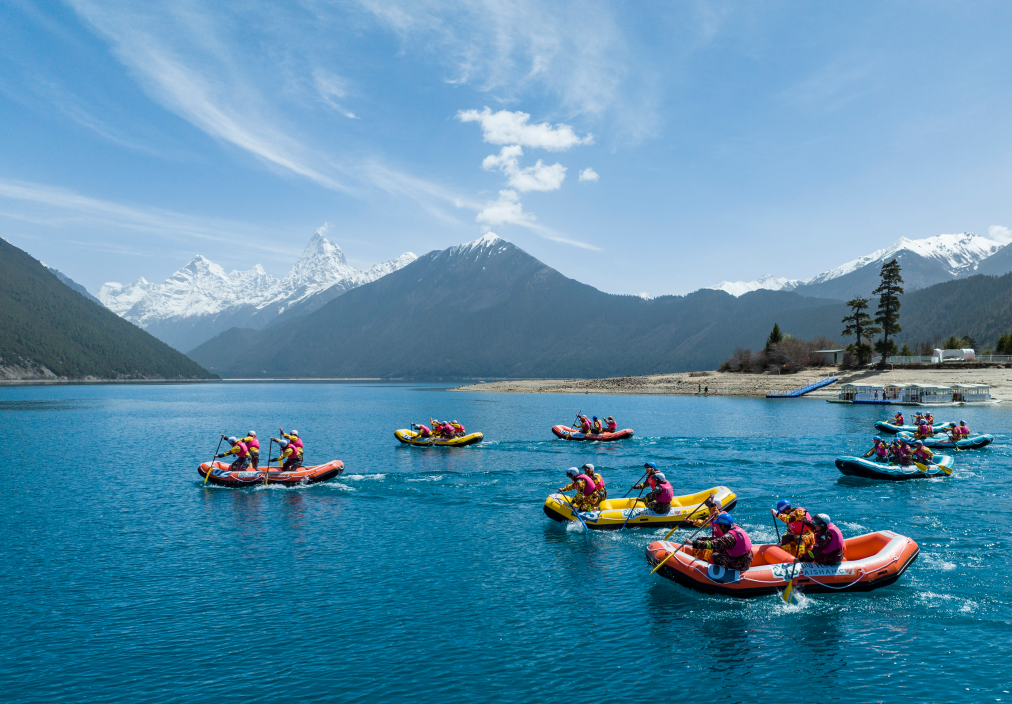 雪山环绕着的湛蓝色巴松措,平静湖面被参赛选手用船桨打破。2023年4月,林芝桃花盛开之际,中国漂流联赛(西藏工布江达县站)比赛在巴松措国家森林公园内举行。