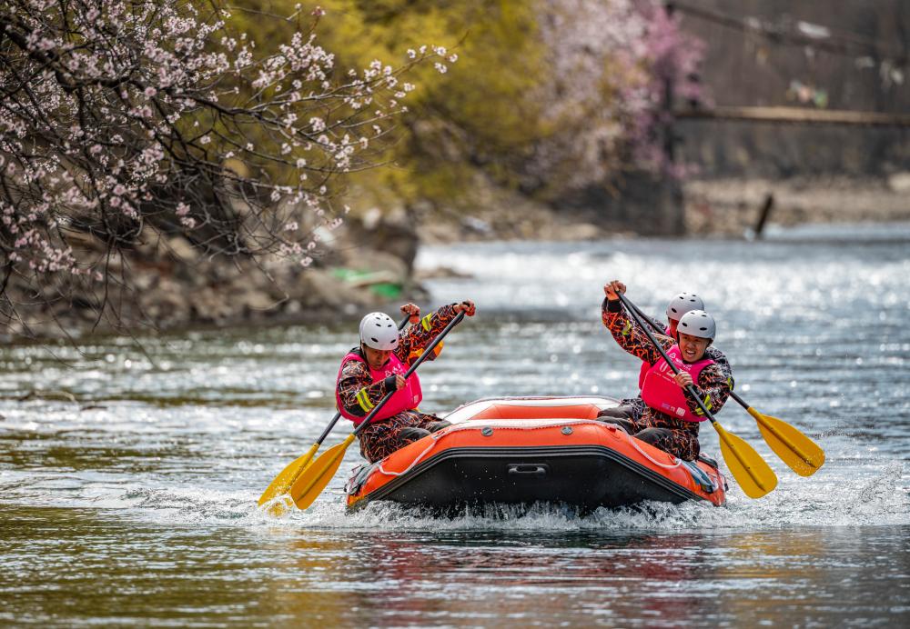 ↑2023年4月15日,选手们在200米静水漂流筏排位赛中。当日,2023年中国漂流联赛(西藏工布江达县站)在西藏林芝市巴松措国家森林公园开赛。