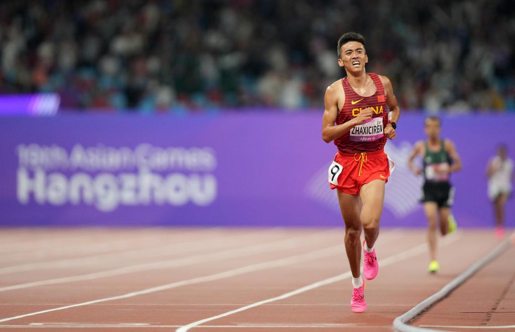 ↑中国运动员扎西次仁在第十九届杭州亚运会男子5000米决赛中(2023年10月4日摄)。