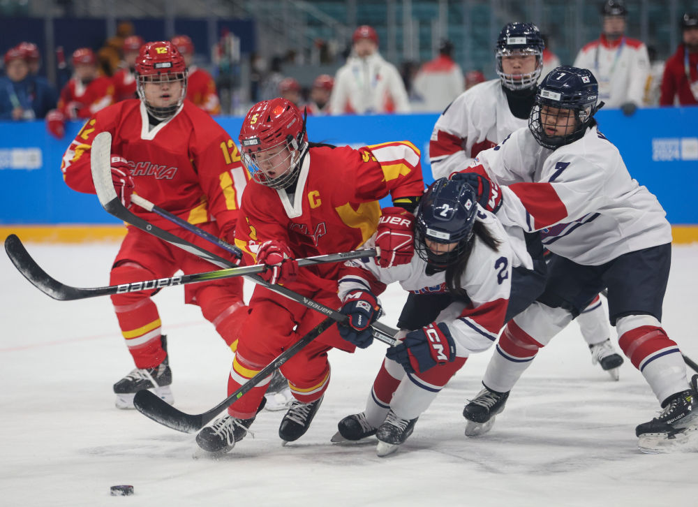 1月20日,中国队球员张安娜(左二)在比赛中拼抢。当日,在韩国江陵进行的冬青奥会女子冰球3对3预赛中,中国队6:3战胜韩国队。新华社记者 姚琪琳 摄