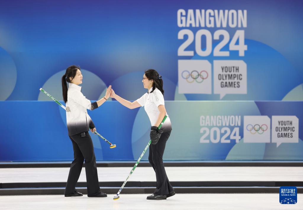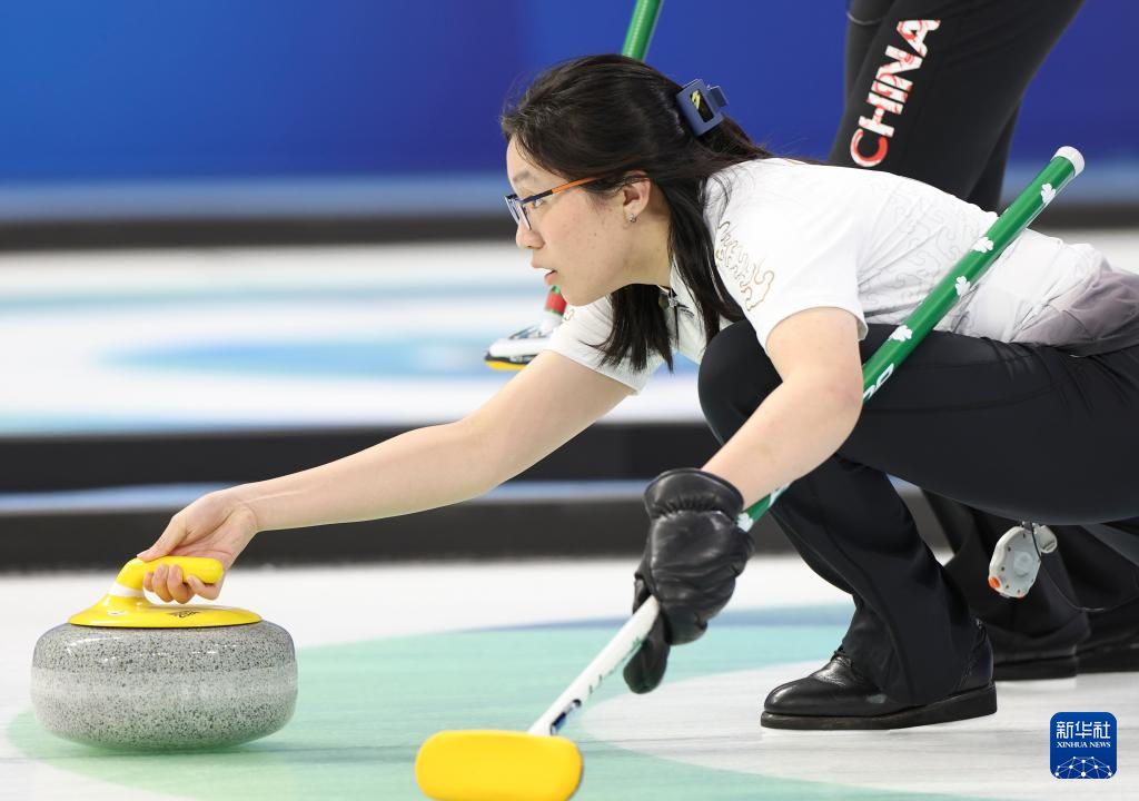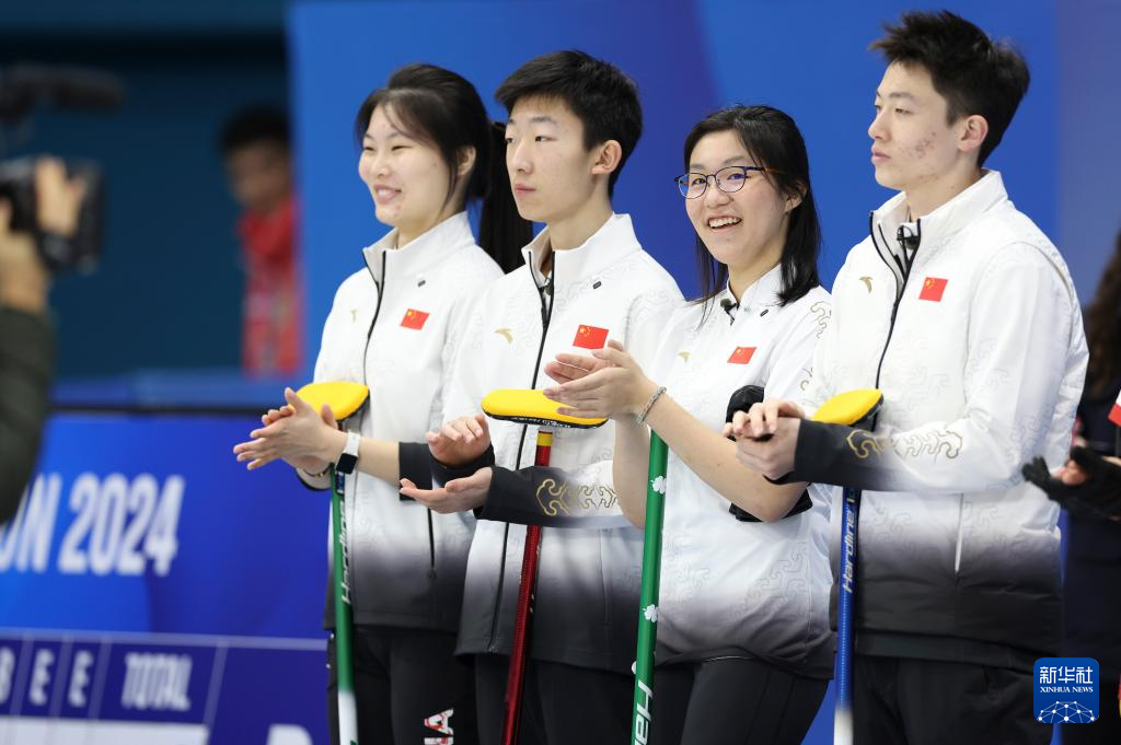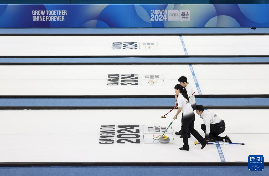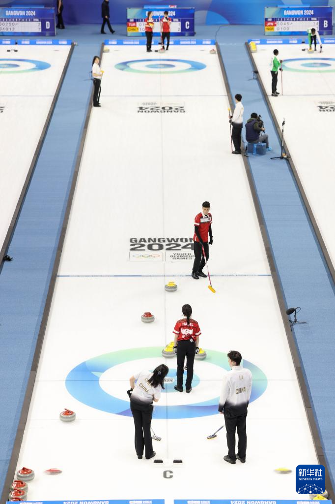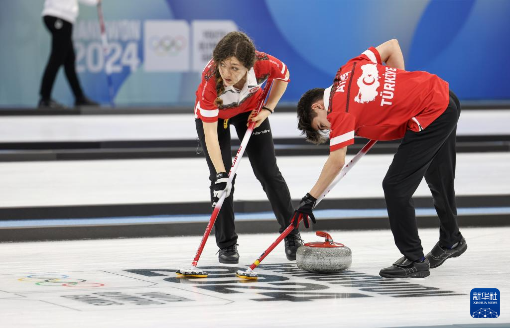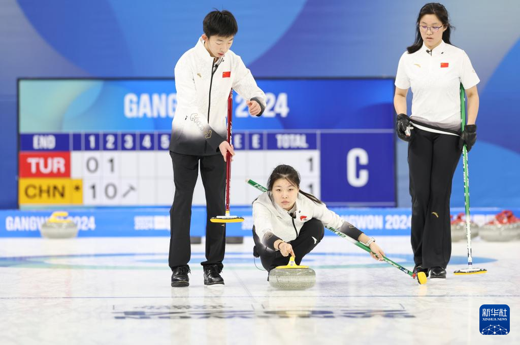 当日,在韩国江陵进行的2024年江原道冬青奥会冰壶混合团体循环赛中。中国队6比2战胜土耳其队。