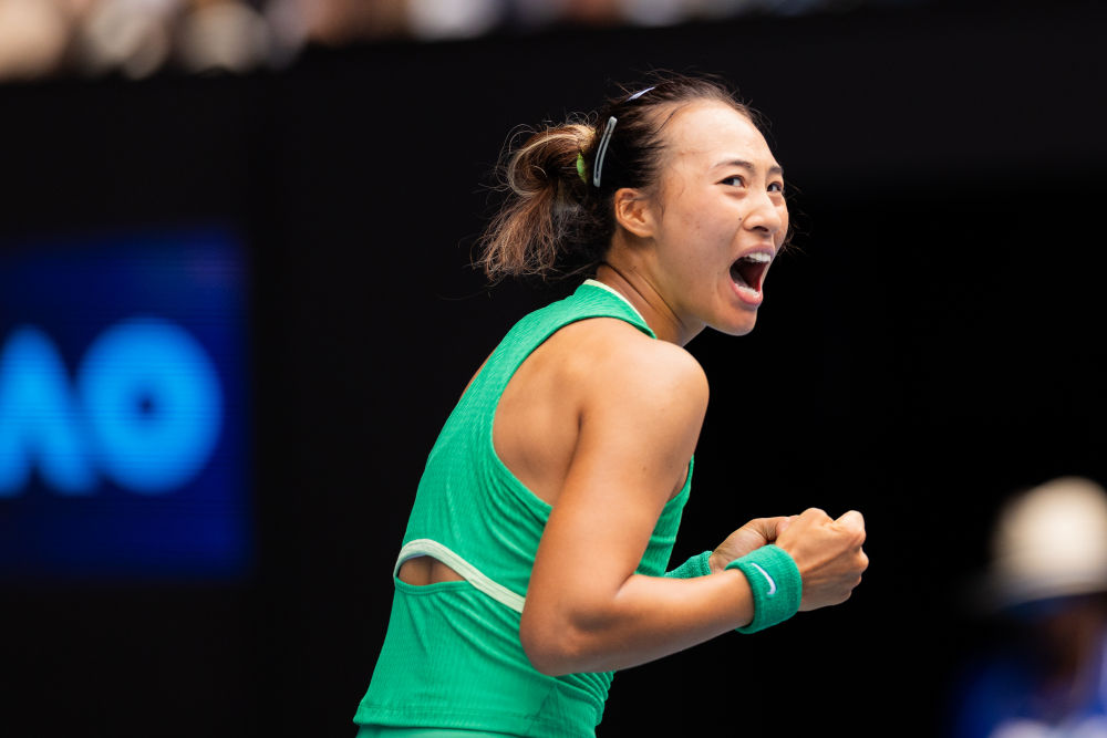 1月20日,郑钦文在比赛中庆祝得分。新华社发(储晨 摄)
